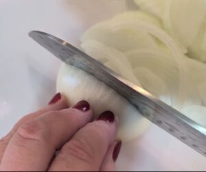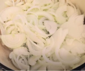 • Slice the 3 medium to large sized onions take care to keep them all the same size